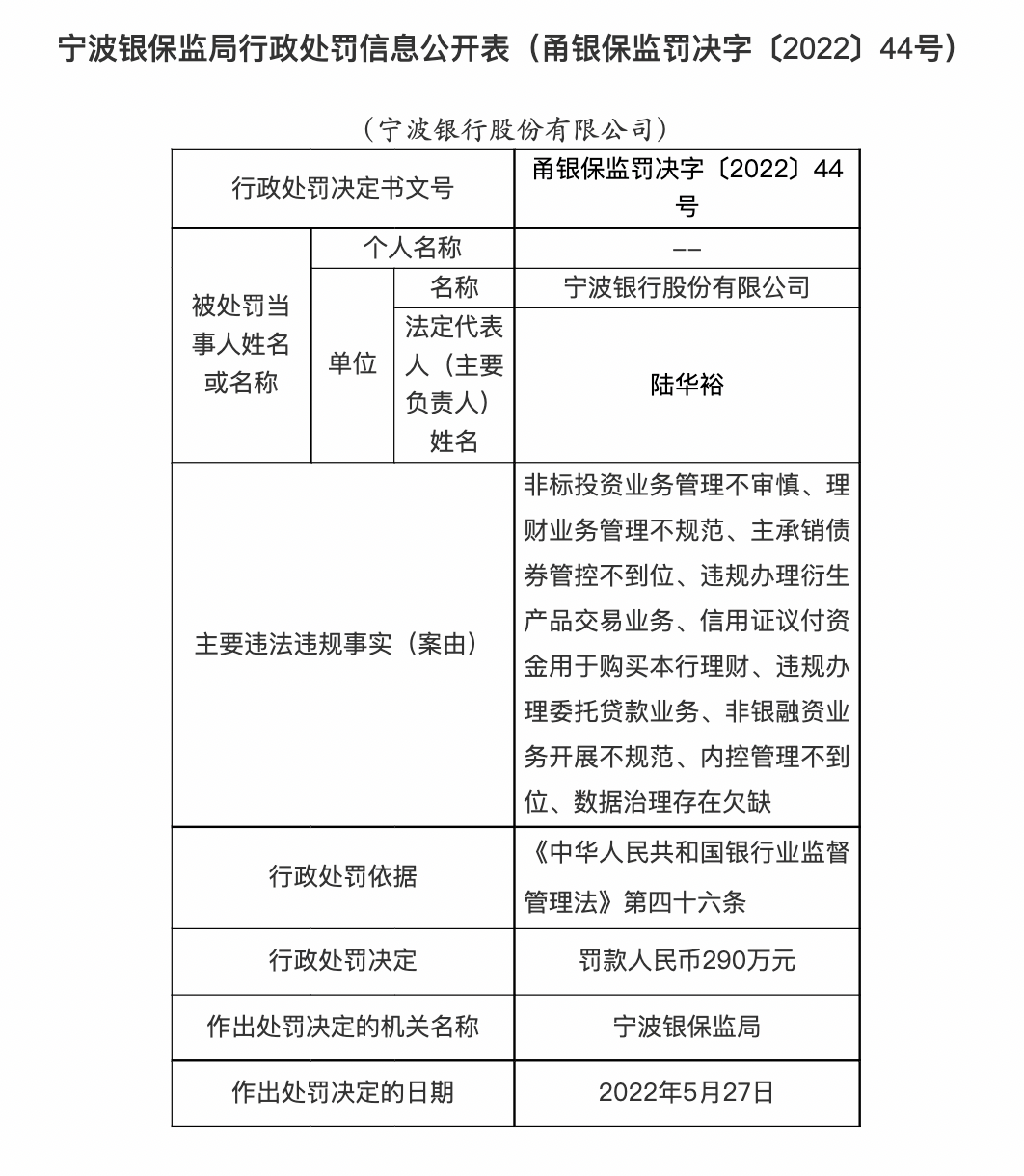 5月27日,银保监会官网更新的处罚公告显示,宁波银行因非标投资业务管理不审慎等九项案由被罚290万元。该行杨妍因对结构性存款业务开展不合规问题负有直接管理责任,被处以警告处罚。