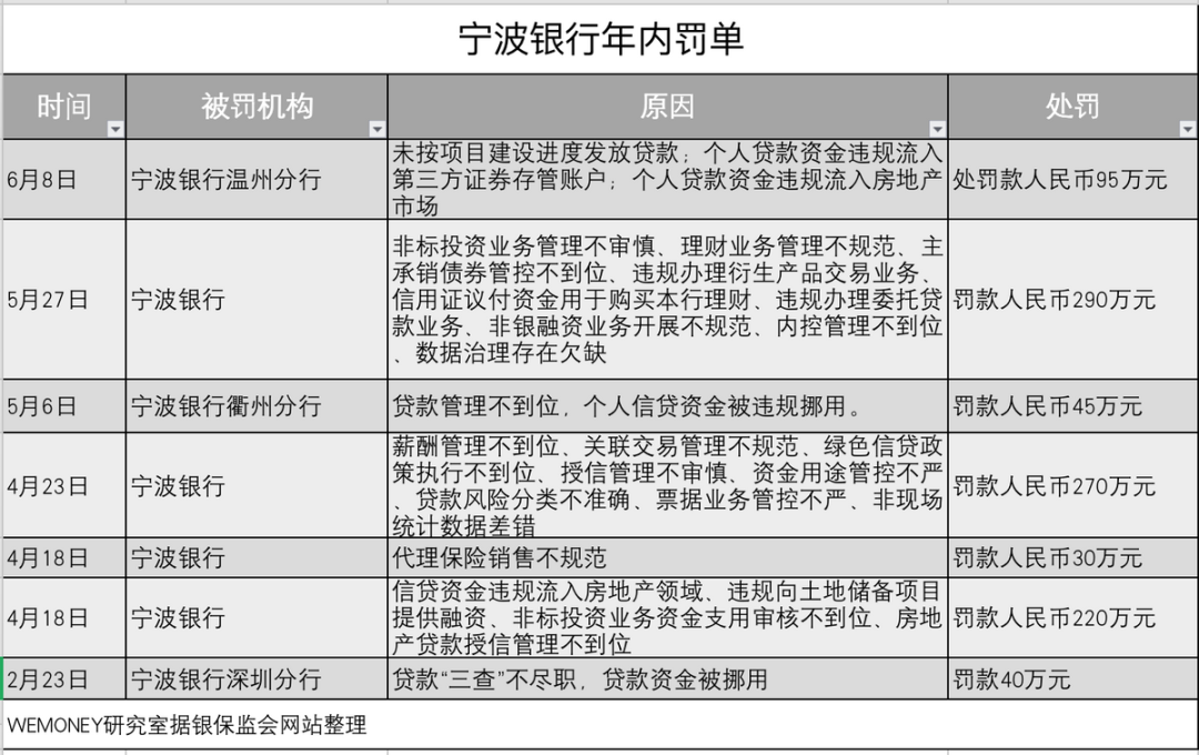 尤其在今年,宁波银行频繁收到百万级别的大额罚单。该行在4月18日、4月23日、5月27日分别被罚220万元、270万元、290万元,暴露出该行存在房地产贷款授信管理不到位、薪酬管理不到位、关联交易管理不规范、绿色信贷政策执行不到位、资金用途管控不严、贷款风险分类不准确、票据业务管控不严、非现场统计数据差错、理财业务管理不规范、内控管理不到位、数据治理存在欠缺等一系列问题。