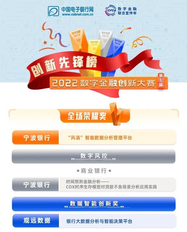 观远数据凭借在数字金融领域的「银行大数据分析与智能决策平台」创新实践案例成功入选「数据智能创新奖」。观远数据服务的客户宁波银行,凭借双方共建的「风控智能数据分析平台」及「时间预测金融分析——COX时序生存模型对贷款不良场景分析应用实践」案例,将本次大赛最高奖项「全场荣耀奖」以及「数字风控银奖」收入囊中。