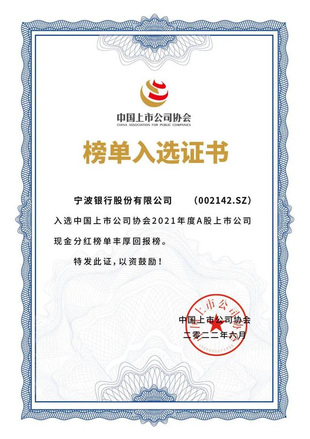 2022年6月,宁波银行入选中国上市公司协会首次发布的“上市公司丰厚回报榜单”,在4800多家主板上市公司中,宁波银行的现金分红水平位列第64位。