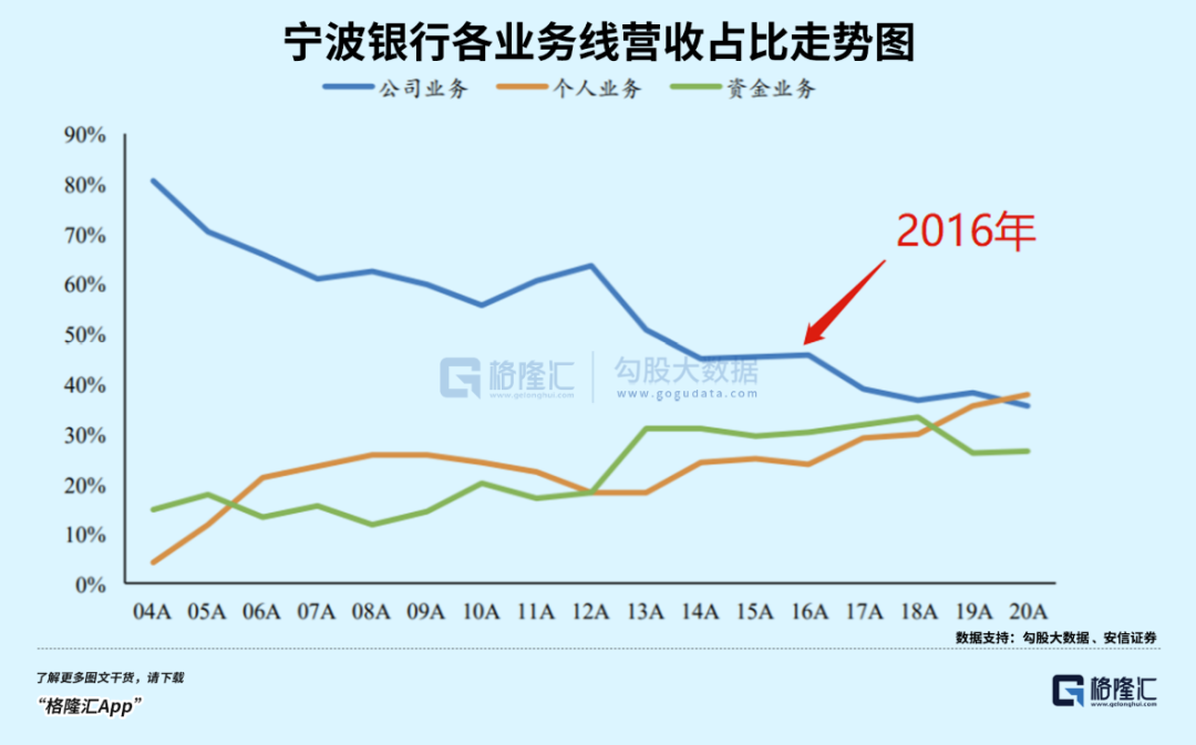 宁波银行通过良好的经营能力以及风控能力,1.0商业模式发挥到极致,2.0商业模式也如火如荼。2020年,公司业务占比营收的35.6%,个人业务占37.8%,超过前者。