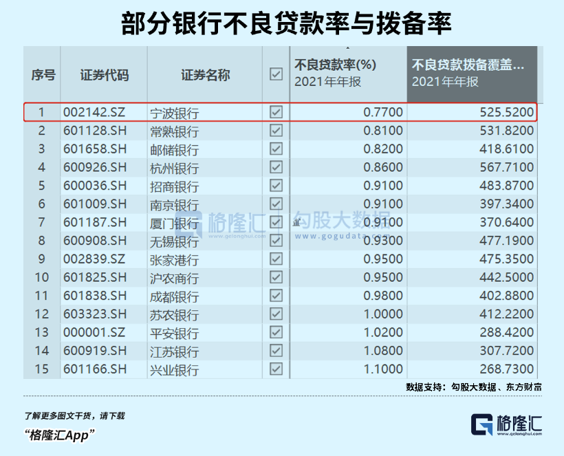 2014-2021年,宁波不良贷款率分别为0.89%、0.92%、0.91%、0.82%、0.78%、0.79%、0.77%。这是42家A股上市银行中表现最为优异的。