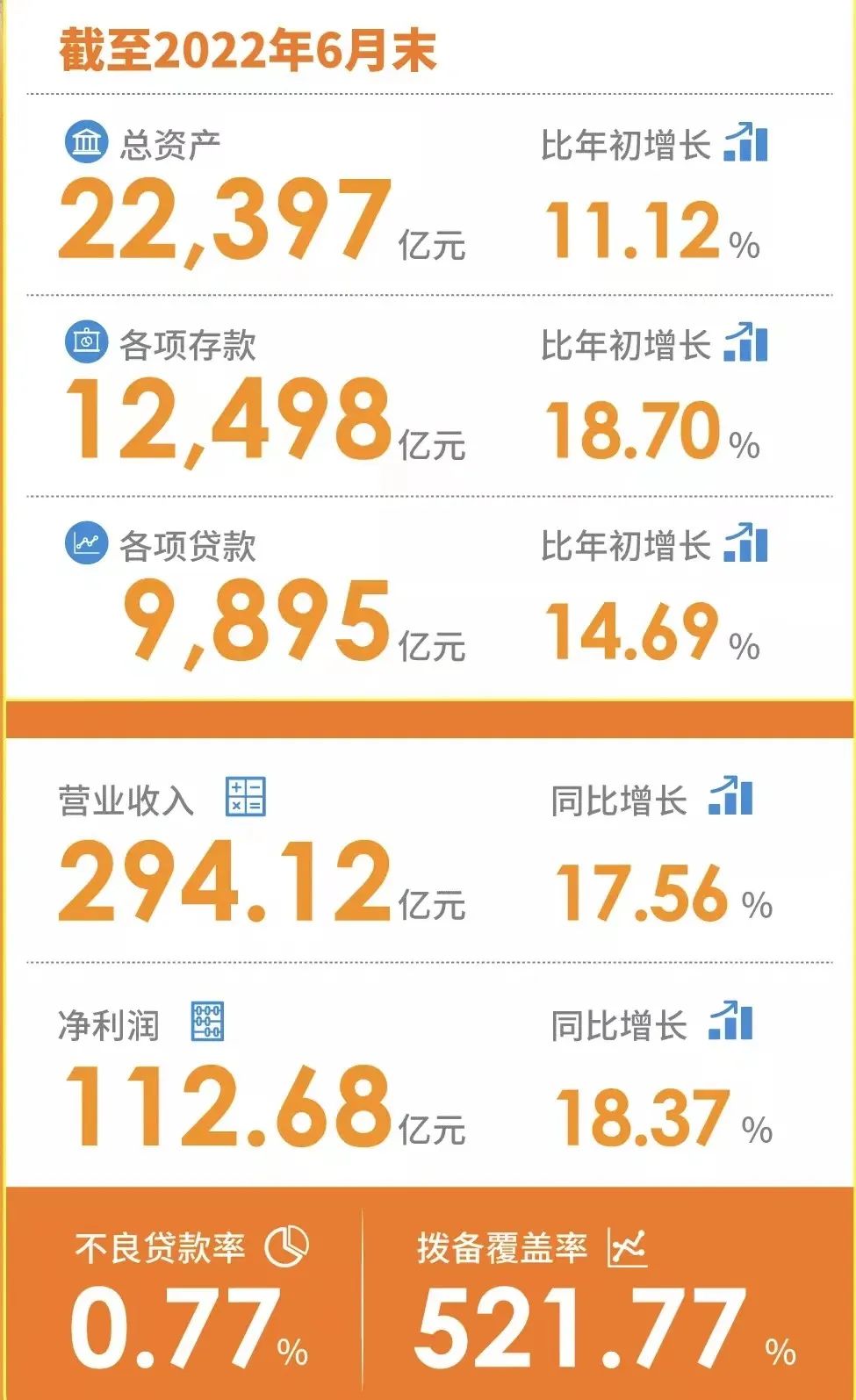 8月26日,宁波银行公布2022年中期业绩报告。今年上半年,宁波银行实现营业收入294.12亿元,同比增长17.56%;实现归属于母公司股东的净利润112.68亿元,同比增长18.37%。截至2022年6月末,宁波银行资产总额达22397.08亿元,比年初增长11.12%。