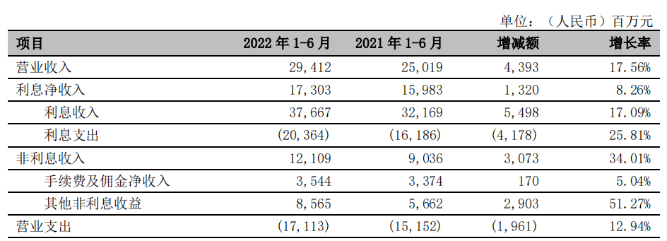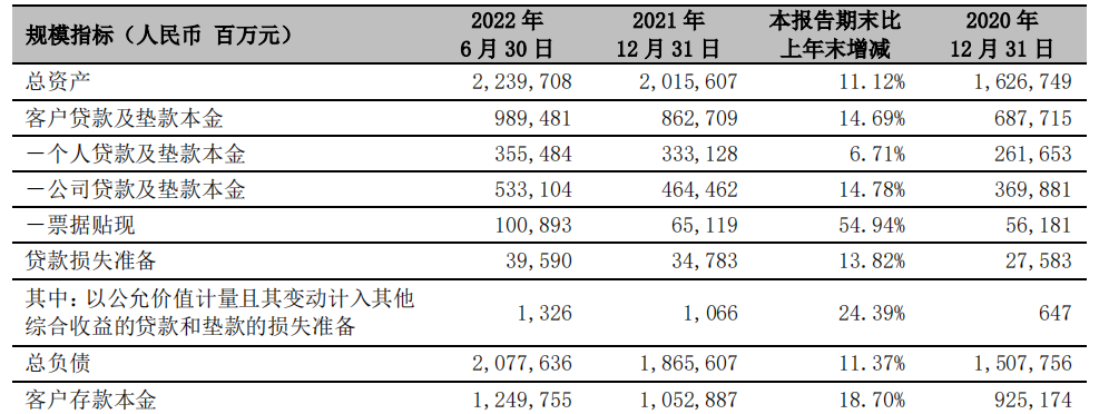 截至2022年6月末,公司资产总额2.24万亿元,比年初增长11.12%;各项存款1.25万亿元,比年初增长18.70%;各项贷款9894.81亿元,比年初增长14.69%。