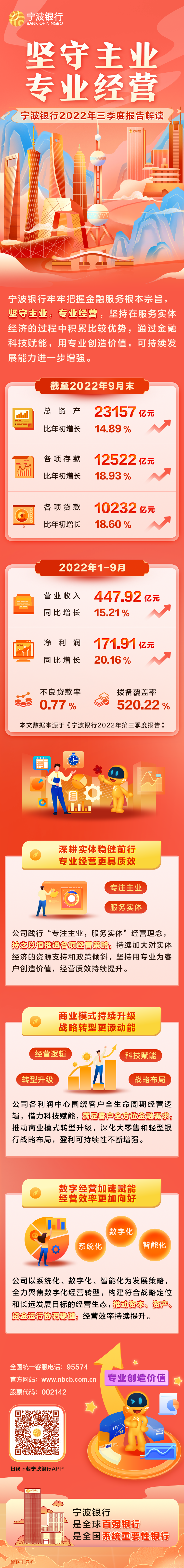 10月27日,宁波银行交了2022年三季度成绩单:营收与净利双增长超15%。三季度业绩报告显示,2022年1-9月,宁波银行实现营业收入447.92亿元,同比增长15.21%;归属于母公司股东的净利润171.91亿元,同比增长20.16%;不良贷款率0.77%;拨备覆盖率520.22%。