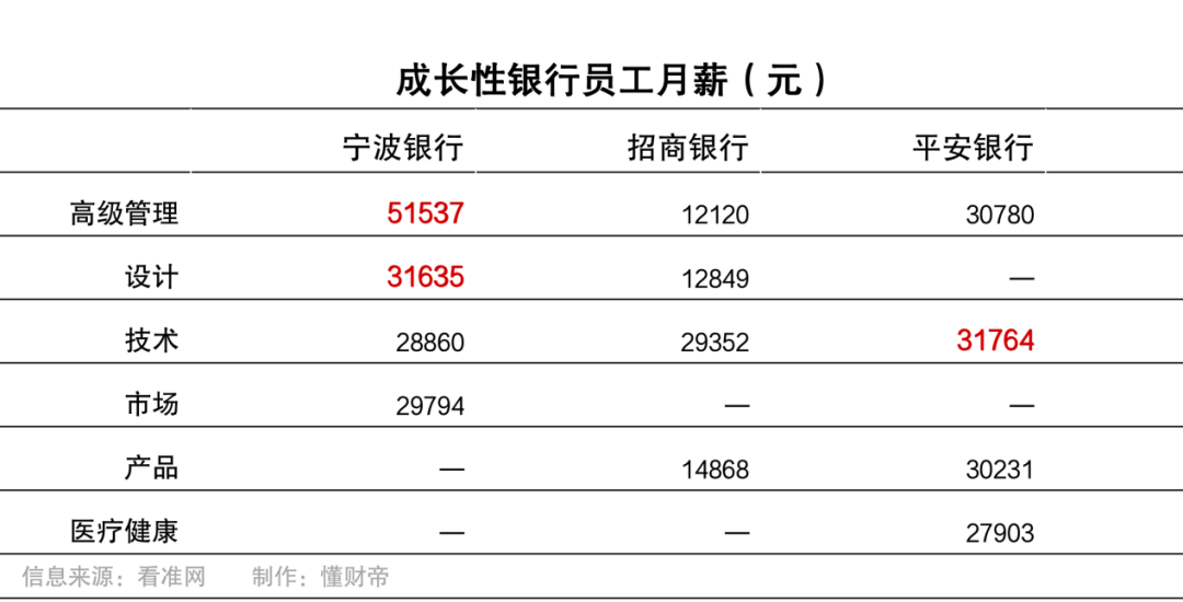 成长性银行员工样本数量20663人,取职位月薪中位数对比。发现宁波银行高级管理、设计岗位,薪资占优势。