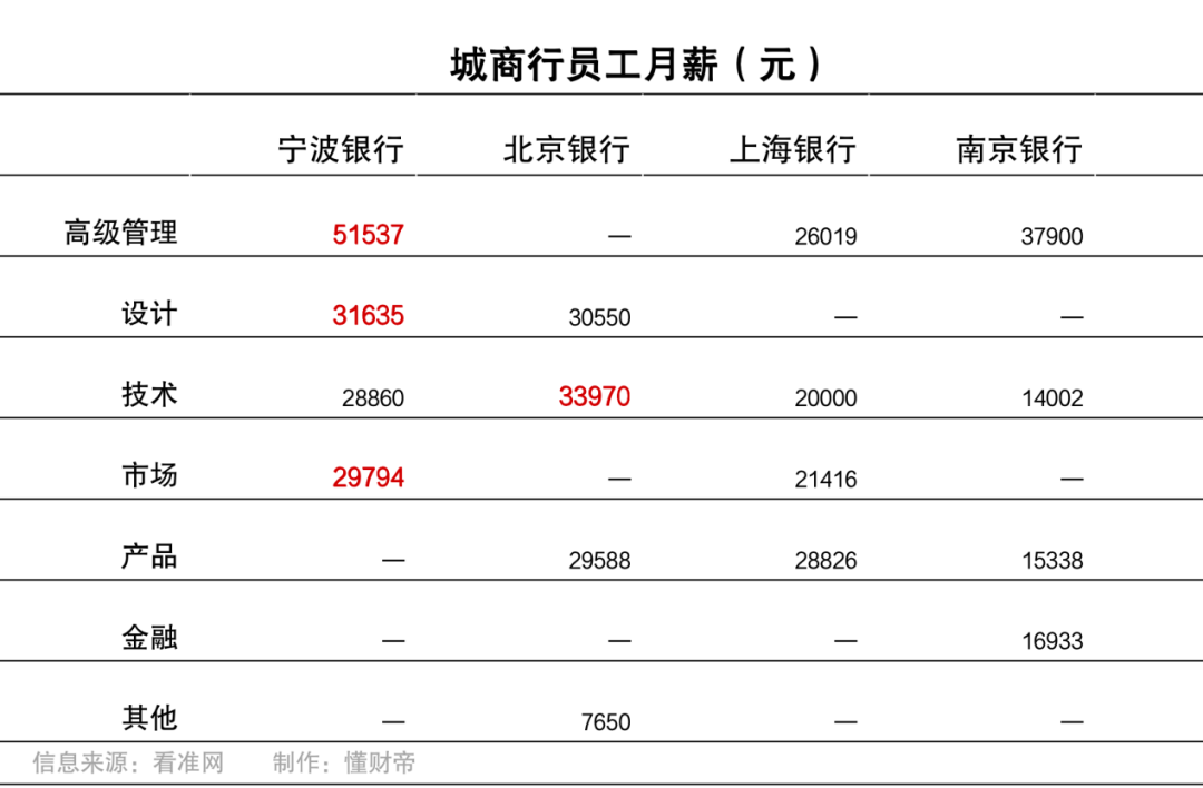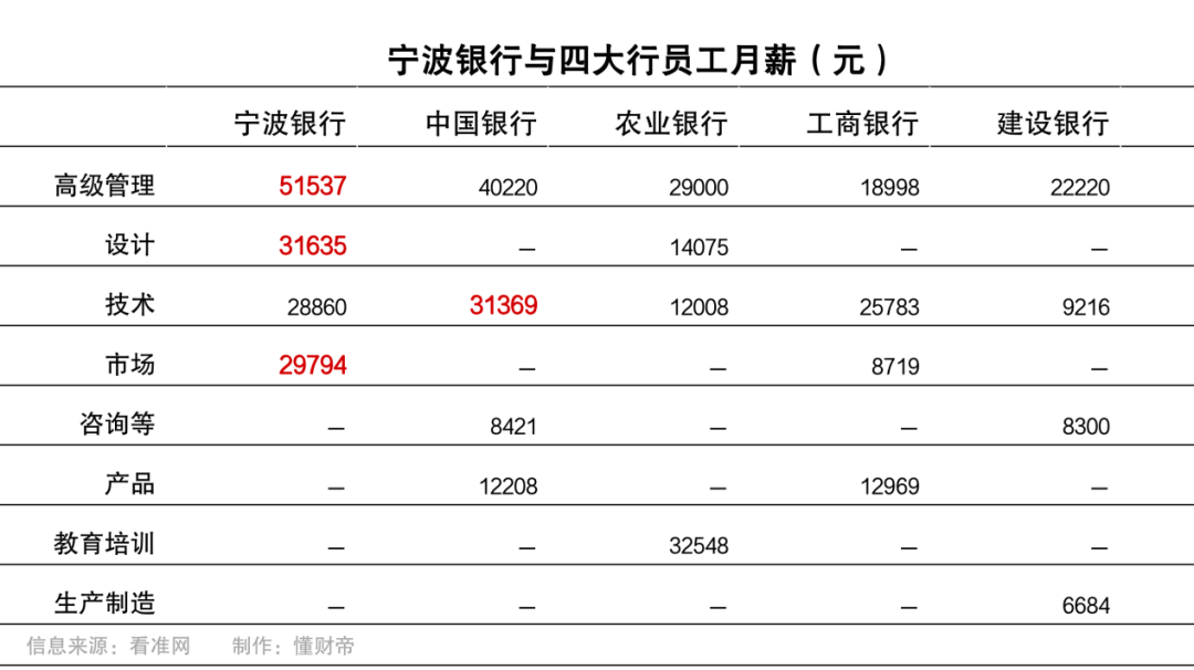 宁波银行与四大行员工样本数量17572人,取职位月薪中位数对比。发现宁波银行高级管理、设计、市场岗位,薪资占优势。