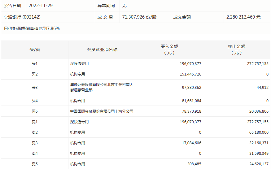 宁波银行今天涨停。盘后数据显示,6个机构出现在龙虎榜单上,合计净买入9694.1万元;海通证券股份有限公司北京中关村南大街证券营业部买入9788.04万元,同时卖出4.49万元;中国国际金融股份有限公司上海分公司买入7837.09万元,同时卖出2003.68万元。