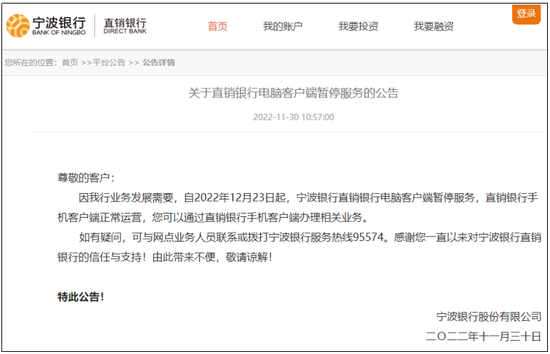 11月30日,宁波银行直销银行官网披露的公告信息显示,因业务发展需要,自2022年12月23日起,宁波银行直销银行电脑客户端暂停服务,直销银行手机客户端正常运营,用户可通过直销银行手机客户端办理相关业务。