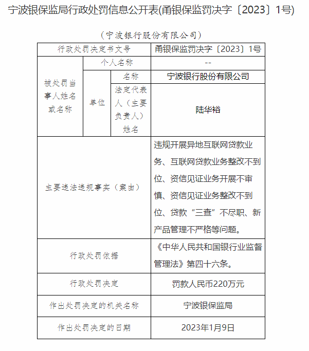 1月13日,中国银保监会官网更新的处罚公告显示,宁波银行被罚220万元,1名责任人被罚。具体违规行为如下: