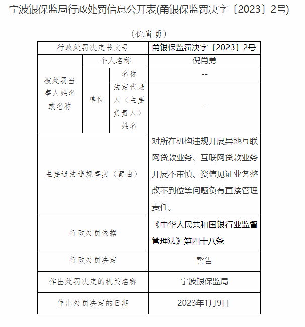 倪肖勇对该行违规开展异地互联网贷款业务、互联网贷款业务开展不审慎、资信见证业务整改不到位等问题负有直接管理责任,被警告。