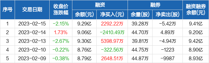融资方面,当日融资买入4563.95万元,融资偿还2271.74万元,融资净买入2292.22万元。融券方面,融券卖出3.11万股,融券偿还8.53万股,融券余量39.28万股,融券余额1195.2万元。融资融券余额合计9.41亿元。