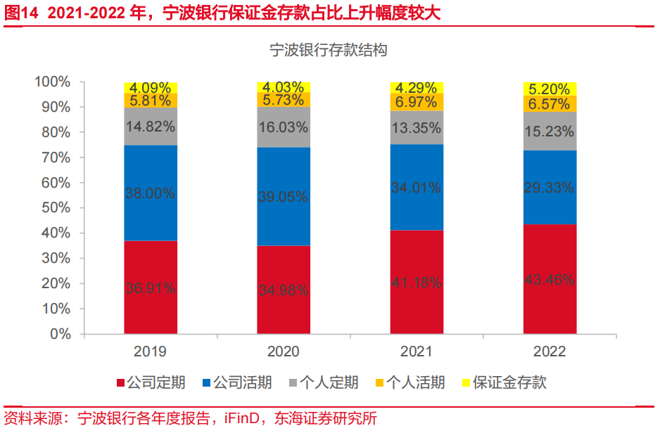 对公存款是宁波银行存款端核心优势,占总存款比重高,2022年末对公存款(含保证金存款)占总存款比重为78%。公司从客户视角经营银行业务,以优质服务换取存款质量。一方面通过优化服务流程,完善基于行业类型、细分领域等不同维度下客户全周期经营视角的服务体系和营销方案,为客户提供专业化、线上化、移动化的服务,量质并举,有效推动结算存款提升。另一方面,通过拓展业务合作场景,为各级政府机关、企业、个人提供更加优质、便捷、高效的金融服务。2022年,公司实施各类数字化项目,实现了省、市、区多项业务资格准入以及重点客户合作,有效带动机构客户资金流提升。