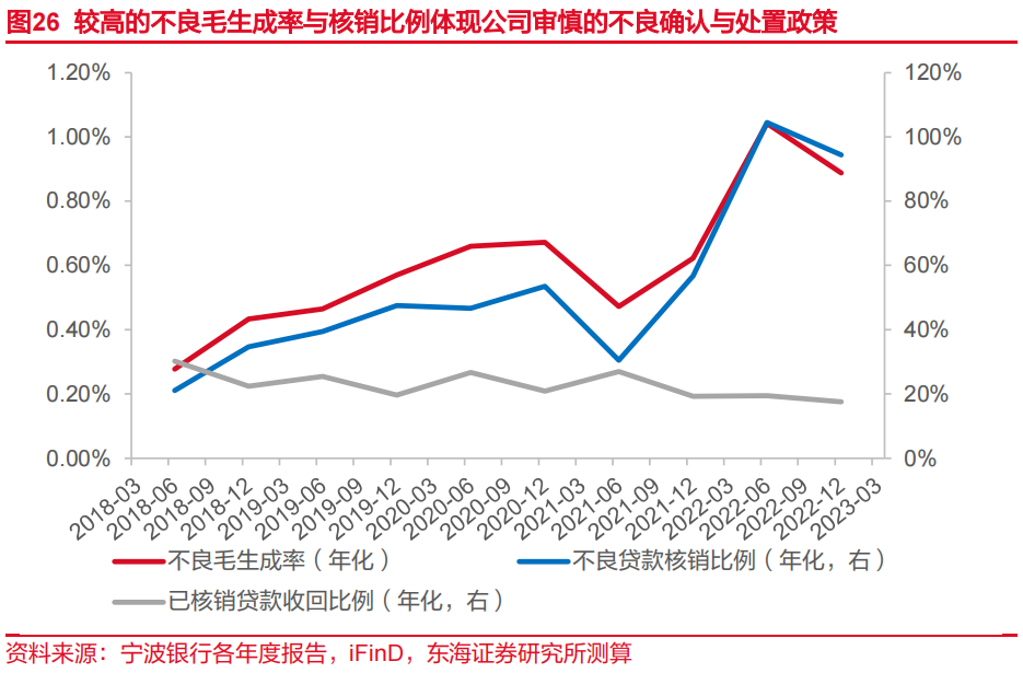 资产质量方面,公司贷款主要分布在浙江、江苏、上海、北京、广东,其中浙江和江苏占比分别为64.33%与22.60%,发达区域经济奠定公司资产质量基本盘。在风险管理方面,公司坚持“控制风险就是减少成本”的风控理念,将守住风险底线作为最根本的经营目标。受益于区域经济与风控能力,公司资产质量长期保持领先位置。动态来看,近年公司不良贷款池周转率较高,意味着不良资产确认与处置较为充分,信用风险出清较好。