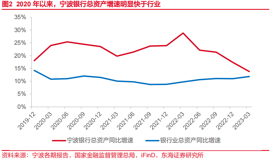 2020年以来,货币政策较为宽松,银行业资产规模保持较快增长。其中,小微普惠领域、制造业领域贷款因受政策支持力度更大而实现快速增长。公司市场定位与上述领域有较多交集,受益于此,公司资产增速明显快于行业。2020-2022年,公司总资产年均复合增速为21.57%,同期银行业总资产年均复合增速为10.41%。