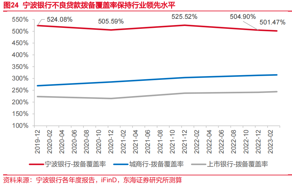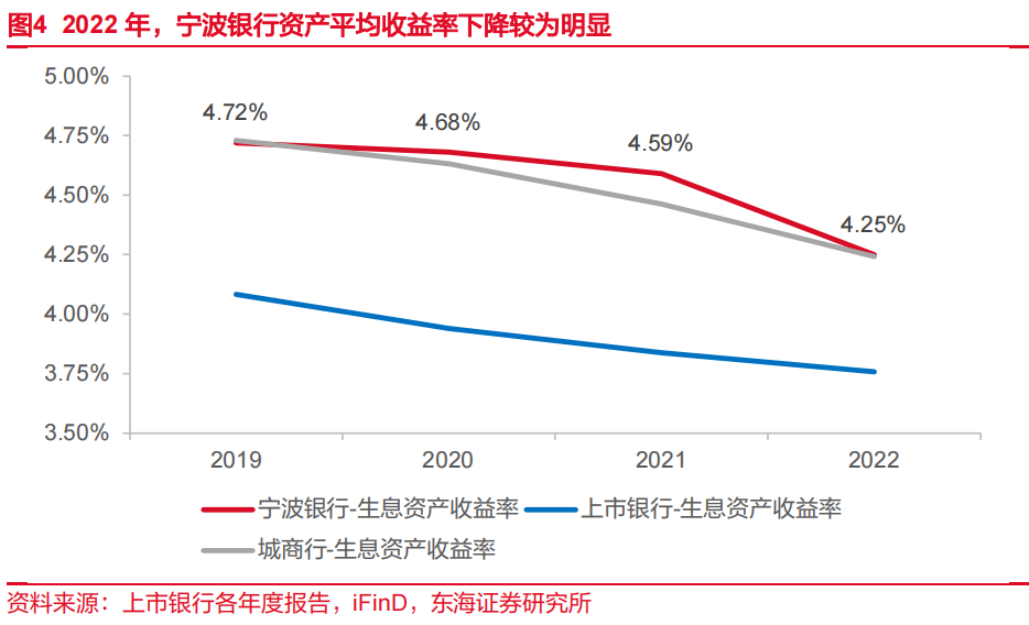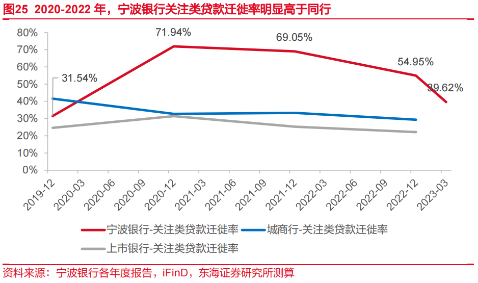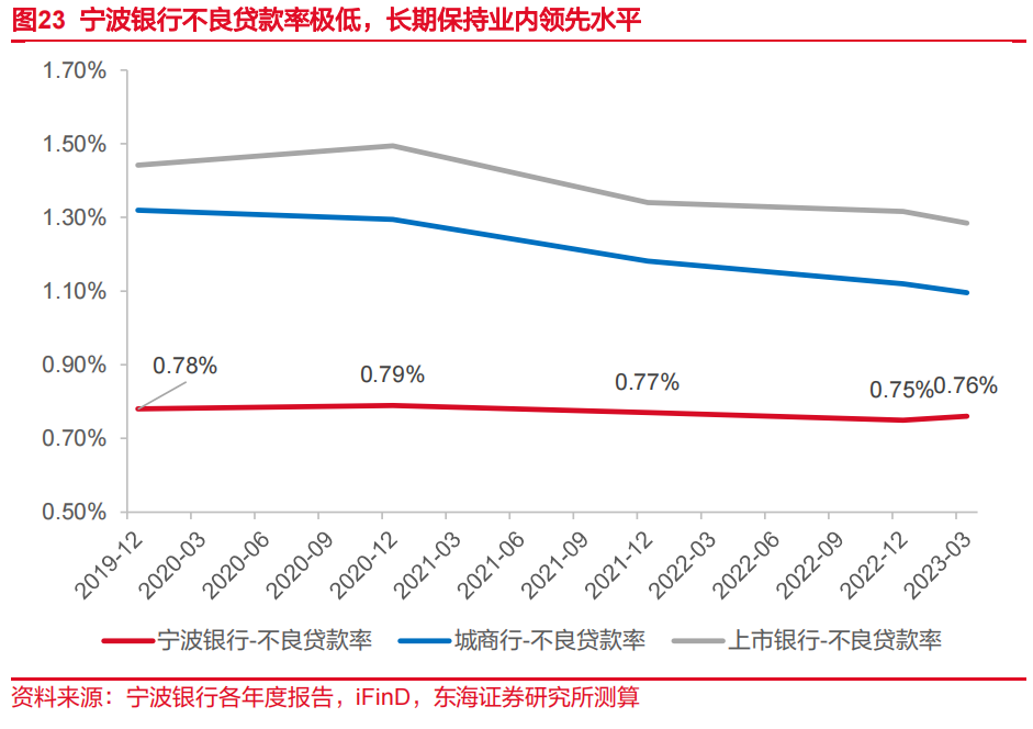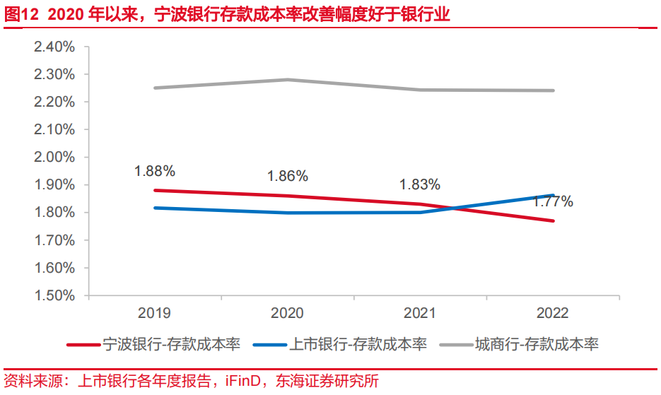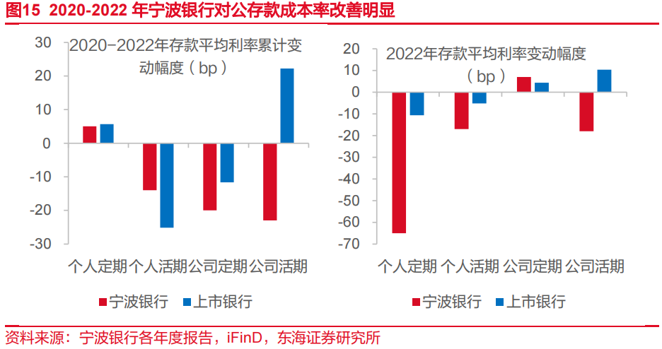 以上质量管理措施产生明显降本效果。2020-2022年,宁波银行对公定期、对公活期分别下降20bp与23bp,上市银行同类型同期分别下降12bp、上升22bp。特别在2022年,在银行业活期存款成本率普遍上升的情况下,活期存款利率降幅明显高于上市银行平均水平。