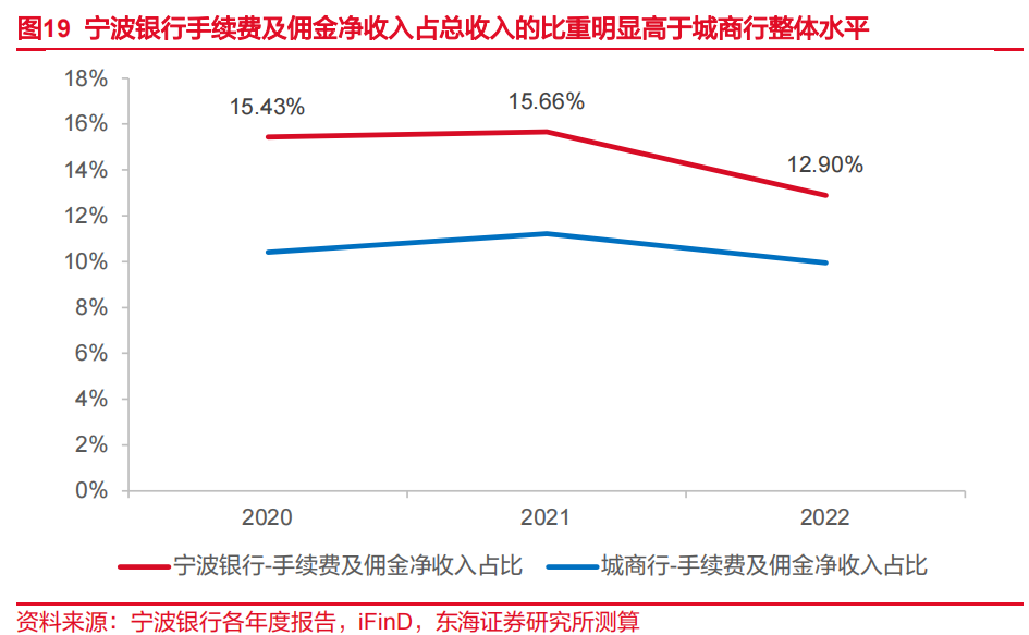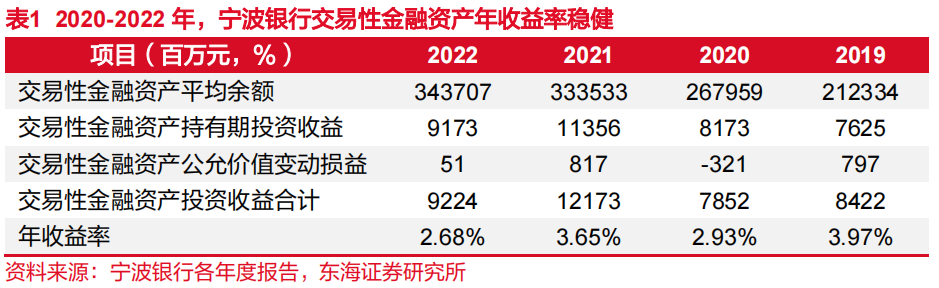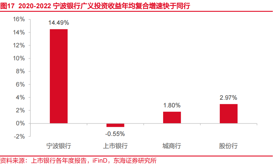 宁波银行投研队伍优势明显,投资交易业务具有较强竞争力。公司充分发挥投研优势,以更高比例的交易性金融资产创造稳健投资收益,进而反哺营业收入并规避信用风险,体现其专业优势与资产安全理念的结合。近年来,公司投资收益表现出色。2020-2022年,宁波银行广义投资收益(投资收益+公允价值变动损益)年均复合增速为14.5%,同期城商行与股份行板块上市银行分别为1.8%与2.97%。
