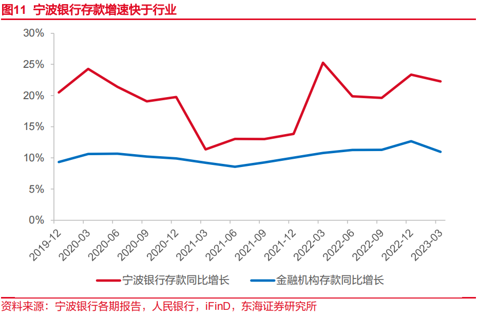 近年公司存款拓展力度大、效果良好,2023年Q1公司存款规模同比增长22.27%,奠定全年存款高增长基础,假设2023年存款同比增长18%。2024-2025年,假定存贷比基本稳定,存款分别同比增长12.30%、11.40%。