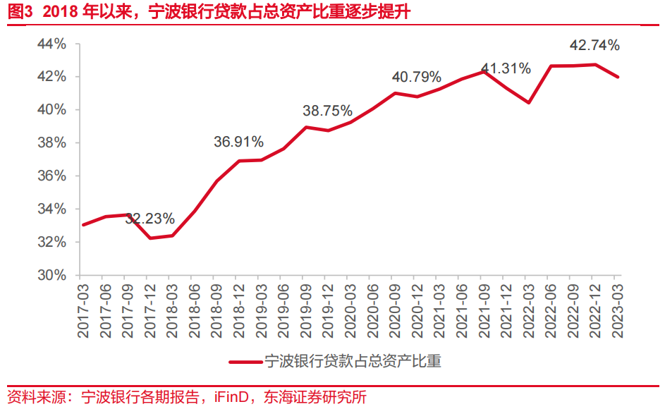 资产结构方面, 2017年以来银行业务“回归本源”趋势明显,贷款占总资产比重明显提升。一方面,影子银行业务在监管引导下稳步压缩,存量非标业务逐步转型为贷款或标准化产品,导致非标投资占比明显下降、贷款占比上升;另一方面,宏观经济压力之下,银行相应监管加大实体经济支持力度,贷款投放力度大于投资端配置力度,也会促进贷款占比提升。在此背景下,宁波银行贷款占比从32.23%(2017年末)快速上升至38.75%(2019年末),2020-2022年进一步上升至42.74%(2022年末)。