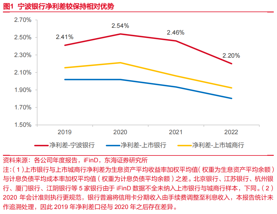资产与负债端双重优势下,宁波银行净利差水平高于同行。2020年以来,受市场环境与货币政策影响,银行业利差趋于收窄。在此背景下,公司充分发挥专业经营优势,采取多种措施加强资产负债管理,净利差依然保持较强较大相对优势。至2022年,宁波银行净利差为2.20%,较上市银行值高40bp,较上市城商行高28bp。
