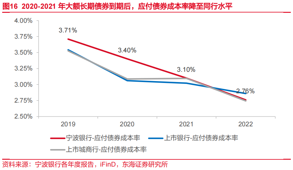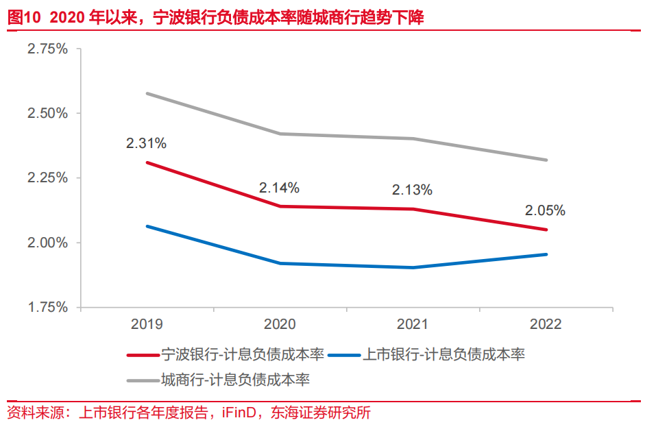 2020-2021年,受益于市场利率下降,上市银行负债成本率在主动负债(包括同业负债与发行金融债券)带动下有所下降。2022年,上市银行平均负债成本率受行业存款成本影响有所上升,但由于城商行主动负债占比更高,计息负债成本率仍在主动负债带动下有所下降。以上背景下,宁波银行负债成本率走势基本与城商行一致。