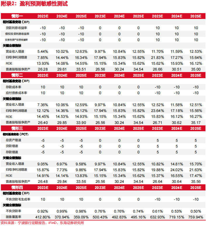 基于基准情形,我们对盈利预测进行了敏感性测试(详见附录2)。测试情形包括:(1)贷款、债权类投资利息收益率以及交易性金融资产投资收益率上下浮动10bp;(2)存款、负债成本率上下浮动10bp;(3)总资产、贷款、存款同比增速上行浮动5百分点。不同情形下,2023年营业收入增速分布区间为5.44%~12.52%,归母净利润增速为7.85%~23.64%。