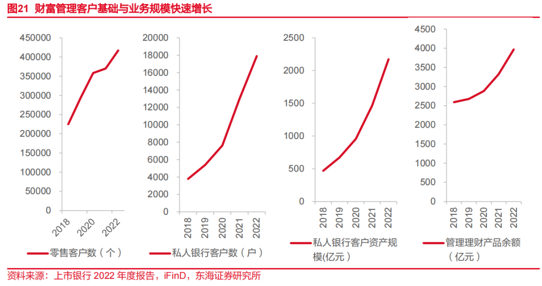 轻资本业务方面,受益于投资银行业务传统优势与财富管理业务的快速发展,公司手续费及佣金净收入占营业收入比重明显高于城商行平均水平。其中,财富管理业务是近年转型发展的重要战略方向,公司秉承“用专业创造价值”的经营理念,持续强化专业服务能力,夯实财富管理业务可持续发展基础,升级公司产品体系和客户经营能力。近年公司财富管理客户基础快速扩大,代客理财、代理基金、代理保险业务收入实现快速增长。