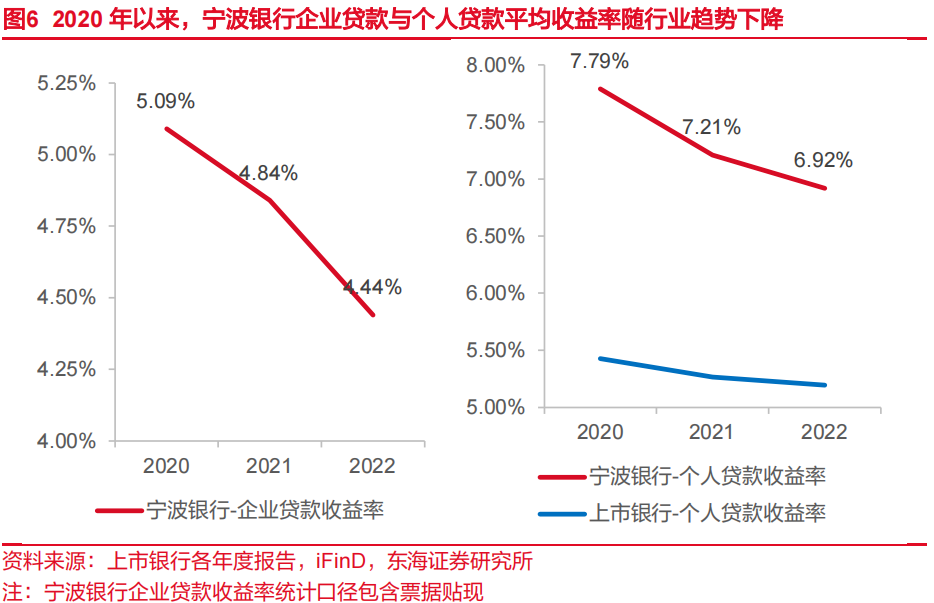 在此背景下,宁波银行一方面跟随LPR下调贷款利率,另一方面通过免息贷款、普惠贷款补贴等开展让利活动,贷款平均收益率随行业趋势下降。2020年,中长期贷款与个人贷款占比上升幅度较大,贷款收益率下降不明显。2022年,受票据贴现利率下降及普惠小微贷款减息影响[1],公司企业贷款收益率下降幅度较大。