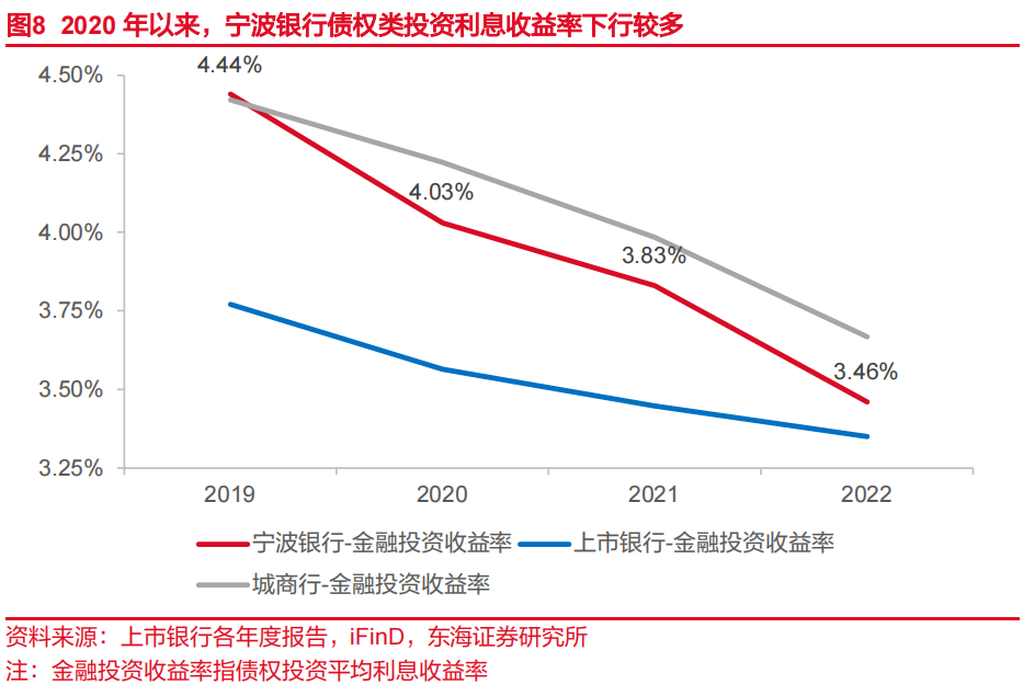 资产收益率方面,受市场环境及结构优化影响,公司生息资产平均收益率有所下降。2020-2021年,受益于个人贷款占比提升,资产收益率下降幅度较缓。2022年资产平均收益率下降较为明显,主要原因在于:贷款端,中小企业贷款及票据贴现利率随市场下降明显;投资端,政府债与同业存单配置力度加大且收益率随市场下降,债权投资收益率降幅较大。