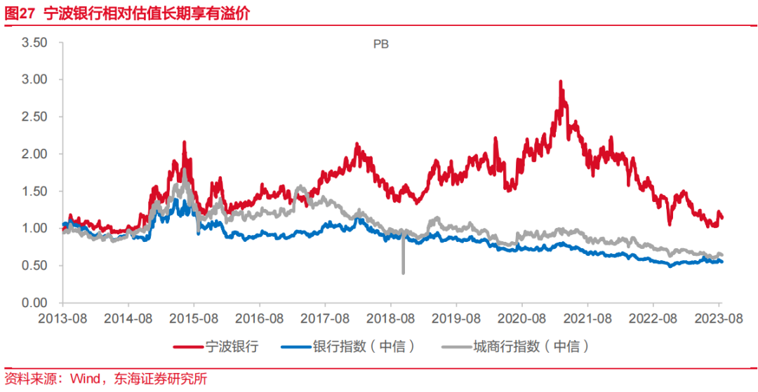 公司治理完善、财务表现领先同业,在二级市场上长期享有估值溢价,截至8月18日,宁波银行相对估值水平为1.16XPB,银行指数为0.55XPB,城商行为0.64XPB。