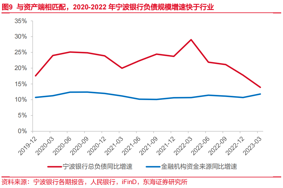 2020-2022年,在较为宽松的货币环境中,行业负债规模与资产匹配,实现较快增长。与资产端快速增长相适应,公司加大存款开拓力度、扩大主动负债规模,总负债规模增速快于行业。2020-2022年,公司总负债年均复合增速为21.77%。