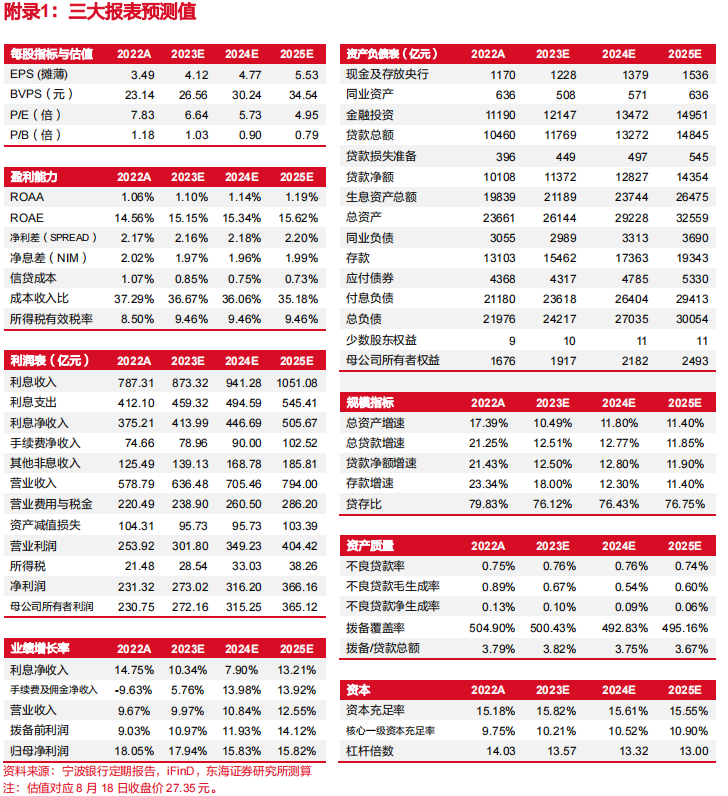 公司业务区域经济发达,实体信贷需求较好,预计公司资产规模将保持较快增长。参照2023年Q1规模增长情况与现阶段金融数据,预计下半年规模增长放缓,假设2023年总资产与总贷款分别同比增长10.49%与12.51%。假设2024-2025年公司总资产分别同比增长11.80%与11.40%,总贷款分别同比增长12.77%、11.85%。
