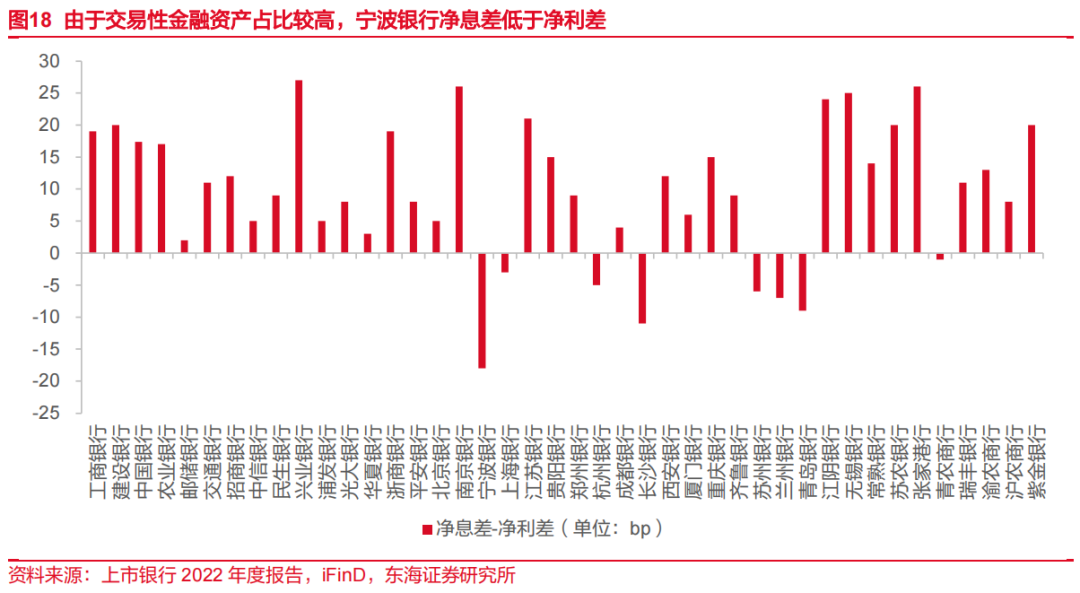 公司较高投资收益可解释其偏离行业的净息差-净利差剪刀差。从上市银行经验看,“净利差低而净息差高”的现象更为普遍,宁波银行则表现为“净息差低而净利差高”。由于净息差计算公式中的利息支出包含了交易性金融资产的资金成本,较高交易性金融资产占比倾向于拉低净息差,进而导致息差低于利差。当交易性金融资产占比高到一定程度,导致生息资产规模小于计息负债时,净息差便会低于净利差。宁波银行高于同行的交易性资产占比导致二者剪刀差大于同行。2022年,宁波银行净利差为2.02%,高于净息差18b。