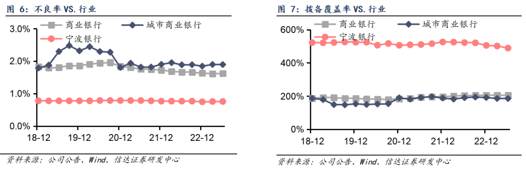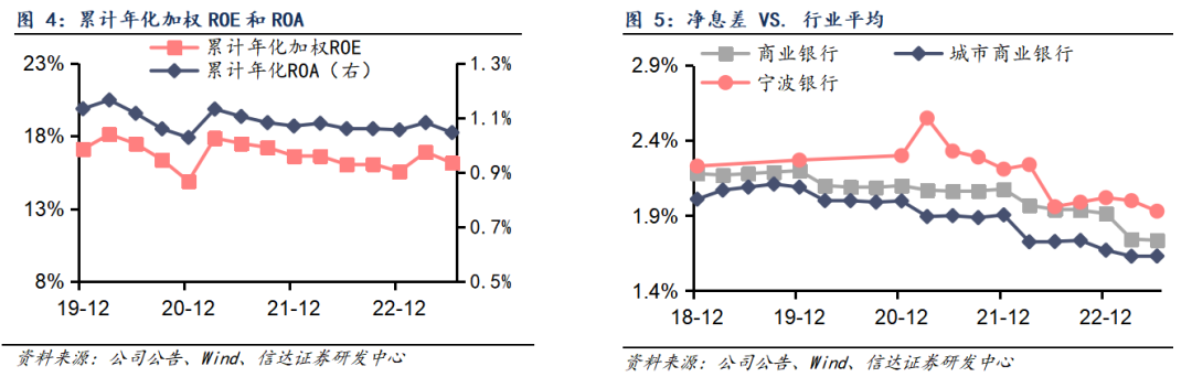 资产质量稳健,核心指标强韧。2023Q2末宁波银行不良率环比持平于0.76%;关注率环比微升1bp至0.55%;拨备覆盖率环比下降12.51pct至488.96%,安全垫依然厚实,抵御风险能力较为强劲,利润反哺空间充足。我们认为,在宏观经济波动、行业竞争加剧的环境下,公司资产质量持续保持行业较优水平,体现出较强的风控意识和风险管理能力。