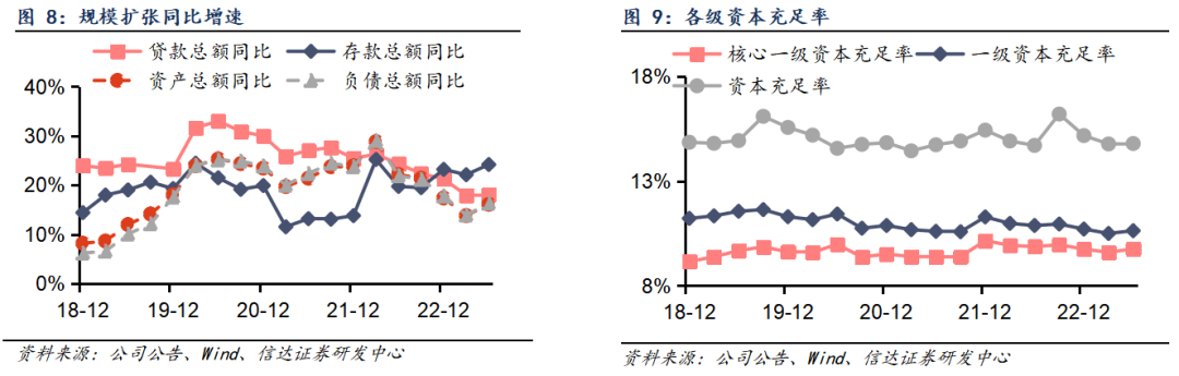 规模加速扩张,资本合理充裕。公司深度把握区域发展优势,2023Q2末资产、贷款、负债、存款分别同比增长16.10%、18.11%、 16.32%、24.17%,增速分别较Q1末提升2.28pct、15bp、2.40pct、2.07pct。Q2末核心一级资本充足率环比提升16bp至9.76%,处于合理充裕水平。今年7月公司发行100亿元永续债,其他一级资本得到有序补充。