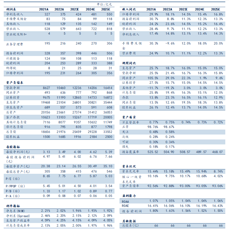 盈利预测:宁波银行深耕优质区域,稳步实施“大银行做不好,小银行做不了”的经营策略,持续深化多元利润中心建设,盈利结构不断优化,风险管理卓有成效。我们看好公司未来发展前景,预计公司2023-2025年归母净利润同比增速分别为14.49%、15.40%、16.76%。