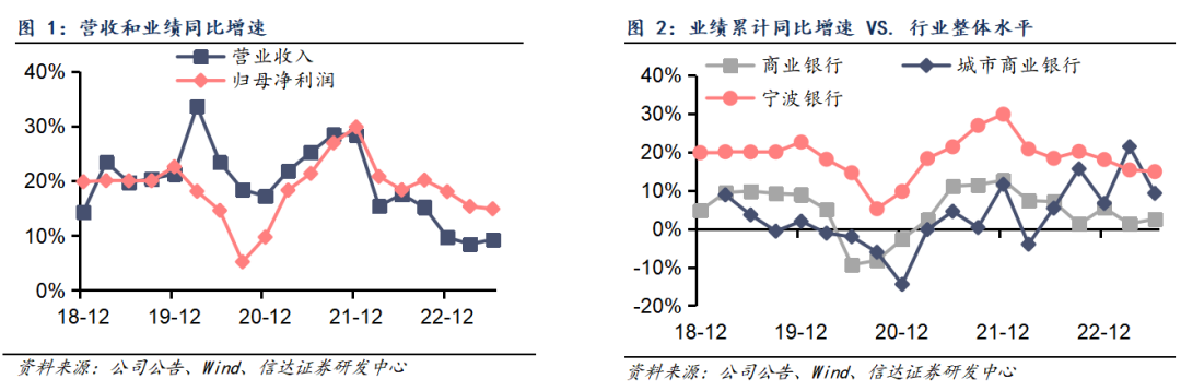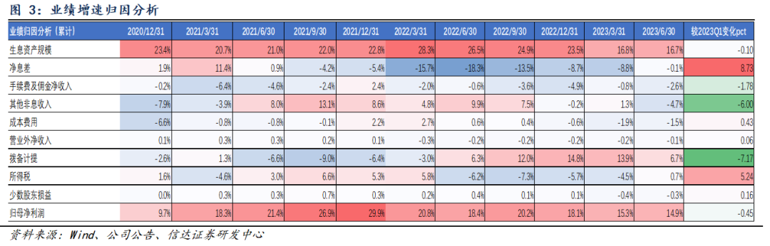 营收增速上行,利润增速稳健。2023H1宁波银行营收同比增速较Q1上升84bp至9.29%;归母净利润同比增速较Q1小幅下降45bp至14.90%。公司利润双位数增长,主要得益于规模较快扩张和拨备反哺;而利润增速较Q1边际放缓,则主要源于投资损益负面拖累和拨备反哺力度减轻。