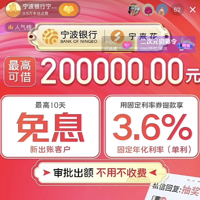 凭借“年化利率3.6%(单利)”“最高可借20万”“最高10天免息”等充满诱惑的宣传词,宁波银行在同类直播中迅速出圈,短时间吸粉近百万。