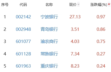 其中,宁波银行、青岛银行、渝农商行、常熟银行、重庆银行位列板块涨幅前五位,涨幅分别为0.97%、0.86%、0.75%、0.27%、0.24%。