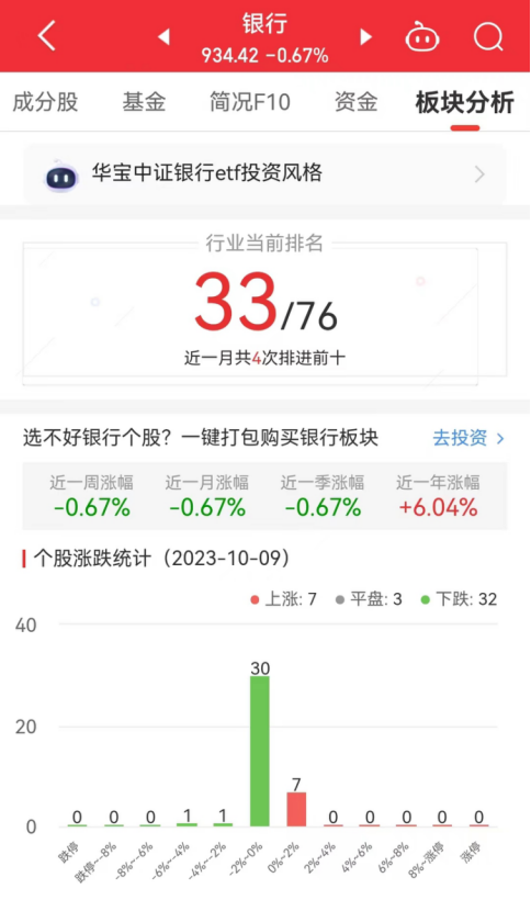 今日,银行板块整体涨幅-0.67%,其中7只股票上涨,3只股票平盘,32只股票下跌。