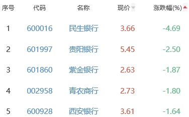 民生银行、贵阳银行、紫金银行、青农商行、西安银行位列涨幅榜后五位,涨幅分别为-4.69%、-2.50%、-1.87%、-1.80%、-1.64%。