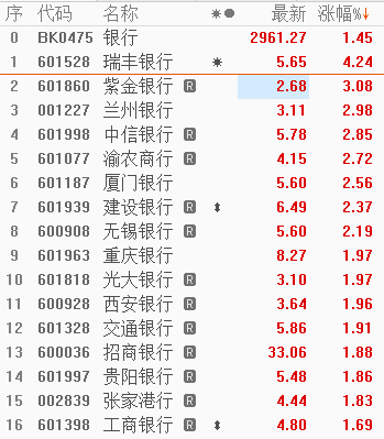 10月12日消息今日A股银行板块受利好消息提振高开后震荡,板块内个股近乎全线飘红,瑞丰银行一度触及涨停,兰州银行涨超3%,建设银行、中信银行、渝农商行、紫金银行等涨超2%,工商银行、交通银行、招商银行等纷纷涨超1%。