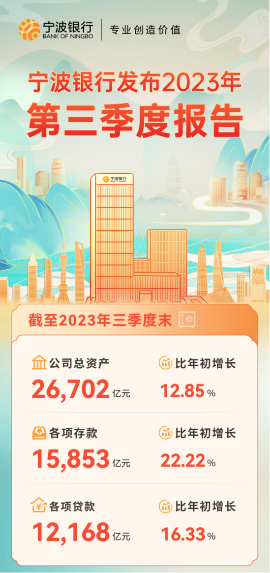 三季报显示,宁波银行公司资产总额26702亿元,宁波银行实现营业收入472.35亿元,同比增长5.45%;归属于母公司股东的净利润193.49亿元,同比增长12.55%,不良贷款率0.76%,拨备覆盖率480.57%,年化加权平均净资产收益率为15.94%。