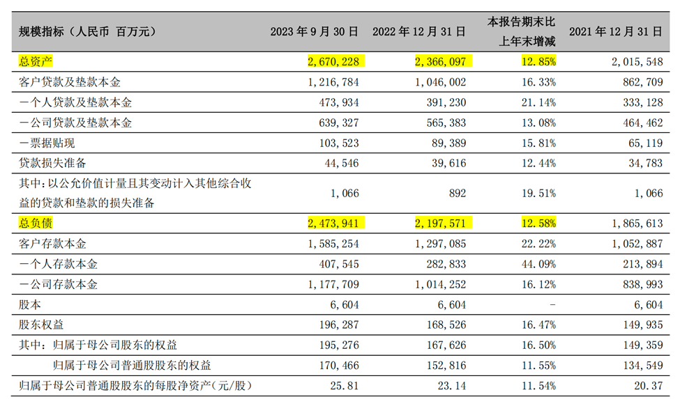先来看“提升经营质效”,刚刚我们提到前三季度宁波银行资产总额实现稳健扩表,资产总额增至2.67万亿元。资产端与负债端两头开花,各项贷款为1.22万亿元,较年初增长16.33%;各项存款为1.59万亿元,较年初骤增22.22%。