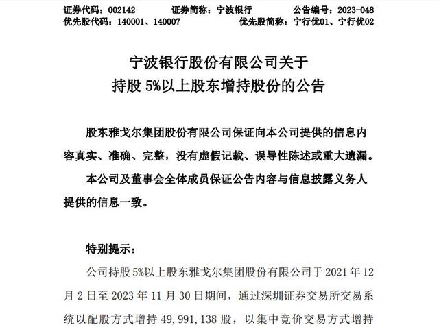 据了解,雅戈尔此次增持主要是基于对宁波银行投资价值和未来前景的良好预测。此次增持后,雅戈尔累计持有宁波银行股份6.59亿股,持股比例将上升至9.97%,跃升为宁波银行第三大股东。
