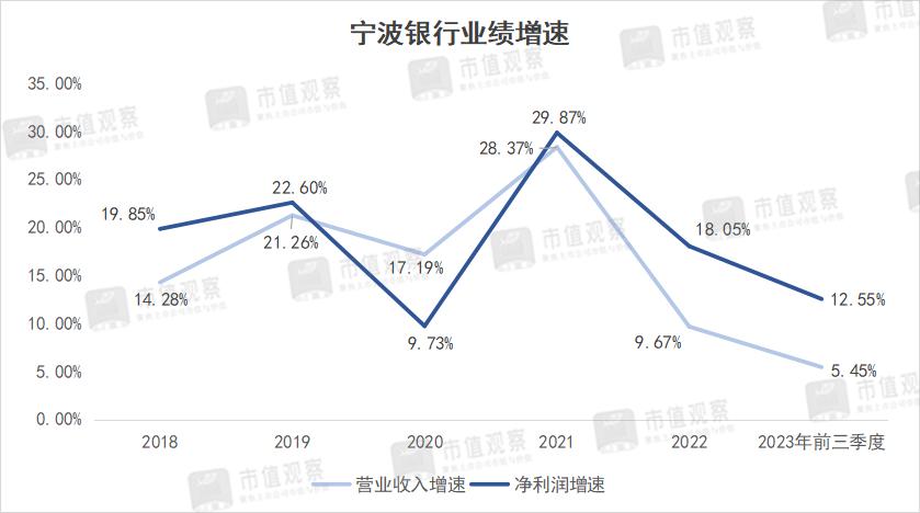 从宁波银行业绩的角度看,2021年后,其营收和净利润增速下滑趋势十分明显,到2023年前三季度已经降到了个位数,甚至营收增速还创出了近10年新低。