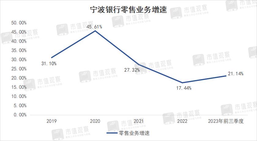 为提振业绩,宁波银行加快了零售贷款投放,2023年前三季度规模增速为21.14%,环比上半年的12.71%明显加快,也高于公司贷款的13.08%。即便如此,也没能挽救业绩下滑的态势。