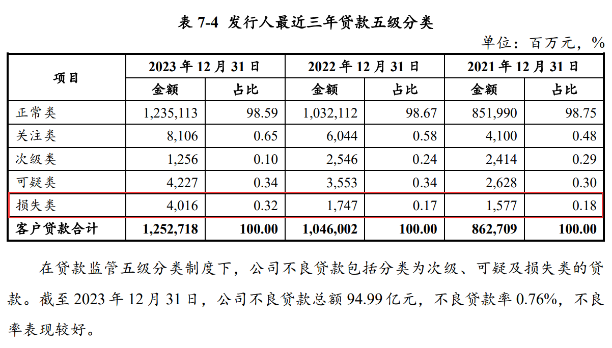 值得注意的是,尽管宁波银行不良贷款率比较稳定,但该行不良贷款余额增速迅猛,年均增长率约20%。其中,该行2023年不良贷款余额同比增长21.07%,2022年不良贷款余额同比增长18.54%。截至2021~2023年末,该行损失类贷款余额分别为15.77亿元、17.47亿元、40.16亿元。其中,该行2022年损失类贷款余额同比增长10.78%,2023年损失类贷款余额同比增长更是高达129.88%。
