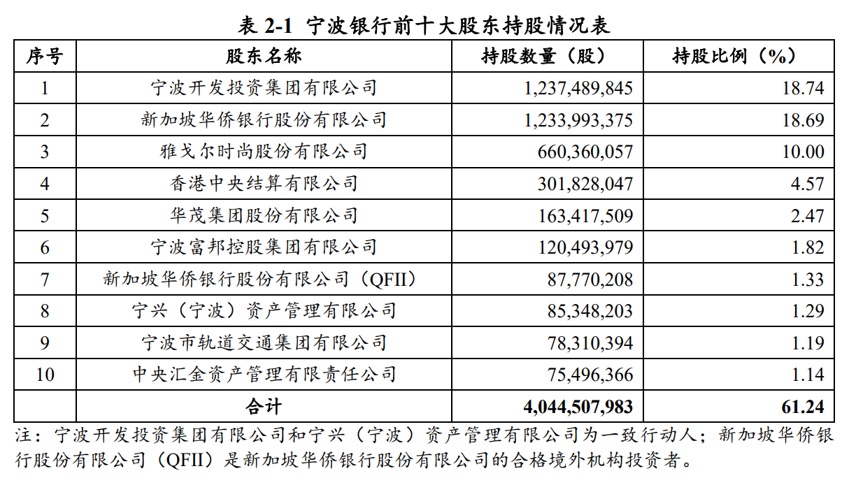 公开资料显示,宁波银行前身为宁波城市合作银行,成立于1997年4月,由宁波市财政局、宁波经济技术开发区财务公司、宁波城市信用合作社及市联社的原股东共同发起设立;1998年6更名宁波市商业银行,2007年4更为现名。该行前三大股东分别为宁波开发投资集团、新加坡华侨银行、雅戈尔时尚股份有限公司,持股比例分别为18.74%、18.69%、10.00%。该行目前设有16家分行,并开设永赢基金、永赢金租、宁银理财、宁银消金4家子公司,分支机构数量493个,员工数量27540人。