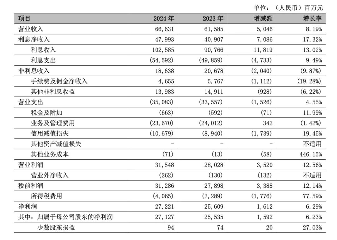 再聚焦宁波银行本身,报告显示,2024年宁波银行整体表现稳健,实现营业收入666.31亿元,同比增长8.19%;归属于母公司股东的净利润达到271.27亿元,同比增长6.23%。这一成绩的取得,进一步巩固了宁波银行在银行业中的地位。